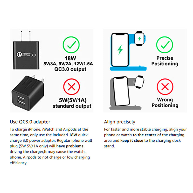 - 3 in 1 Wireless Charger: The wireless charger can charge for mobile phones, apple watches, and Airpods. It's suitable for Apple AirPods 2/AirPods Pro and Apple Watch Series 6/5/4/3/2/1. Support for hybrid charging between Apple and Android. (Note: When charging the phone, earphone, watch together, must use a 12V/2A or 9V/2.7A adapter. The adapter is included in the package)