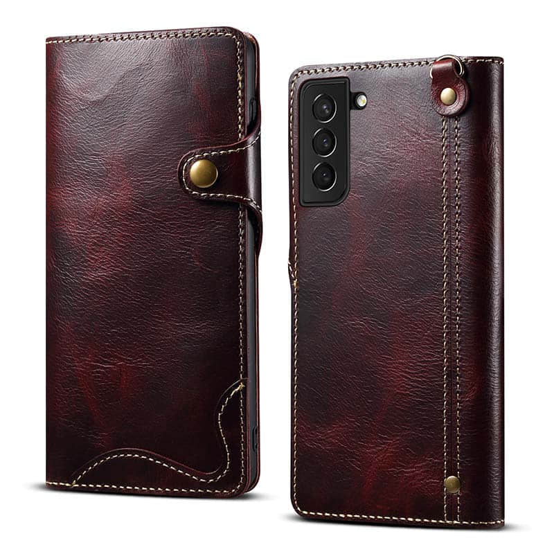 Genuine Cowhide Leather Button Flip Phone Case For Samsung Galaxy S21 Plus 5G - Casekis