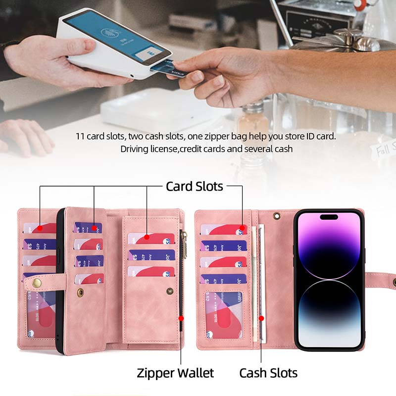 Casekis Zipper 11 Card Slots Wallet Phone Case Pink
