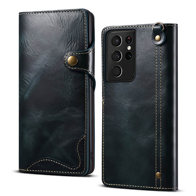 Genuine Cowhide Leather Button Flip Phone Case For Samsung Galaxy S21 Ultra 5G - Casekis
