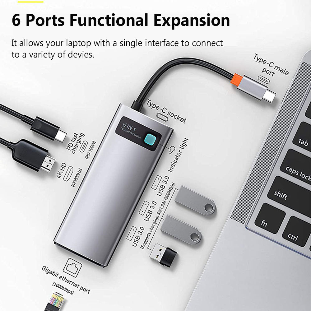- 6-in-1 USB Hub for Efficient Work: With a single interface to connect to a variety of devices, it turns a single USB c port into 6 ports for data transfer, display expansion, internet connection, and charging. All ports work simultaneously without any pressure. No extra driver is needed, plug into your laptop and enjoy amazingly fast data sync.